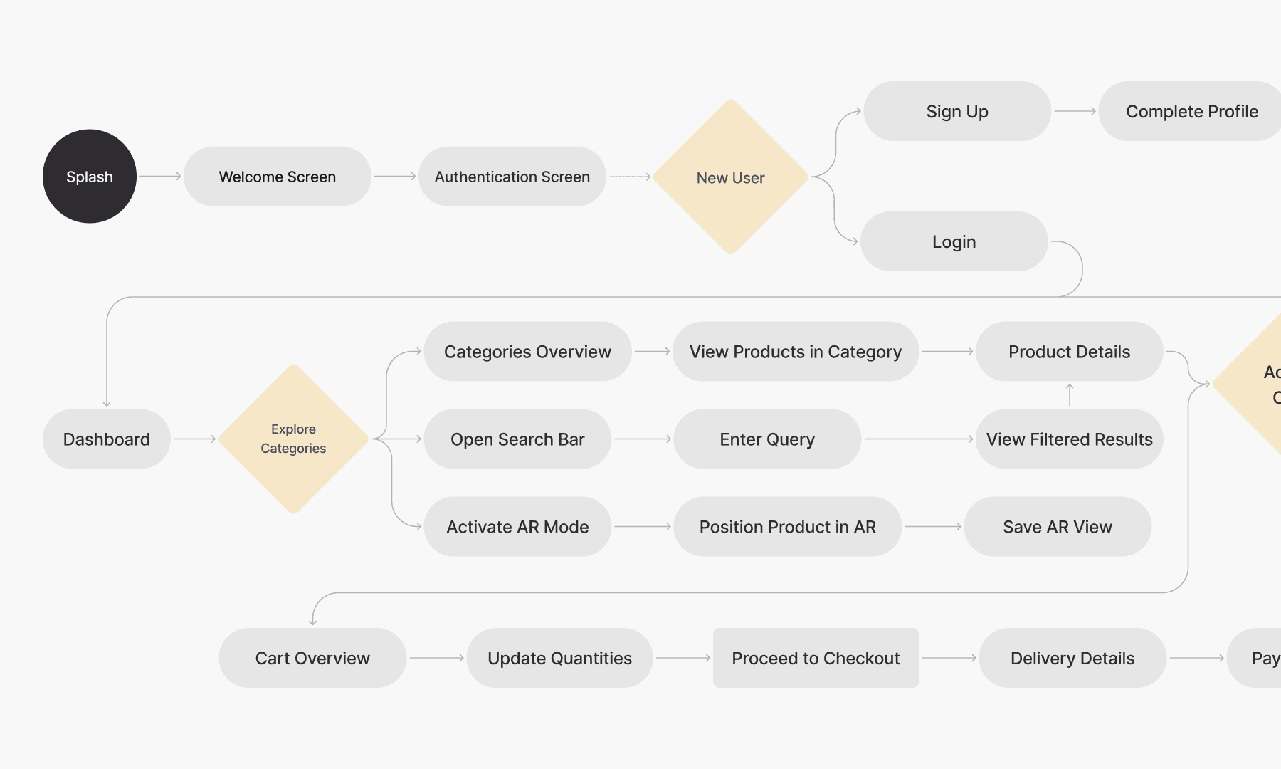 A smooth journey from browsing through AR visualization to personalized recommendations, product selection, and seamless checkout for an enhanced shopping experience.